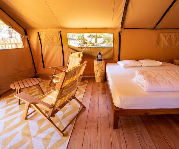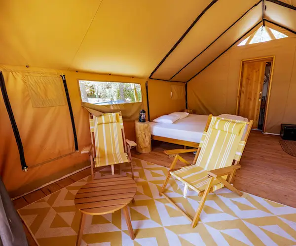 Offrez-vous une escapade romantique dans notre tente Trappeur Duo, nichée au sein de la zone réservée aux adultes de Huttopia Wine Country – Northern California. Idéale pour les couples en quête d’une expérience de glamping intimiste et relaxante, cette tente dispose d’un lit king size de qualité hôtelière, d’une salle de bain privative, ainsi que d’une terrasse privée aménagée où vous pourrez savourer votre café du matin avec des vues exceptionnelles sur la nature.