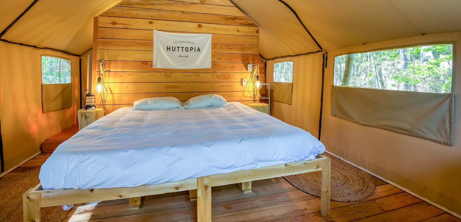 The comforts of home in the heart of nature. Our Trappeur Duo features a king bed and real mattress, plus electricity that powers a mini-fridge, fan, heater (on a 30 minutes timer) and lights.