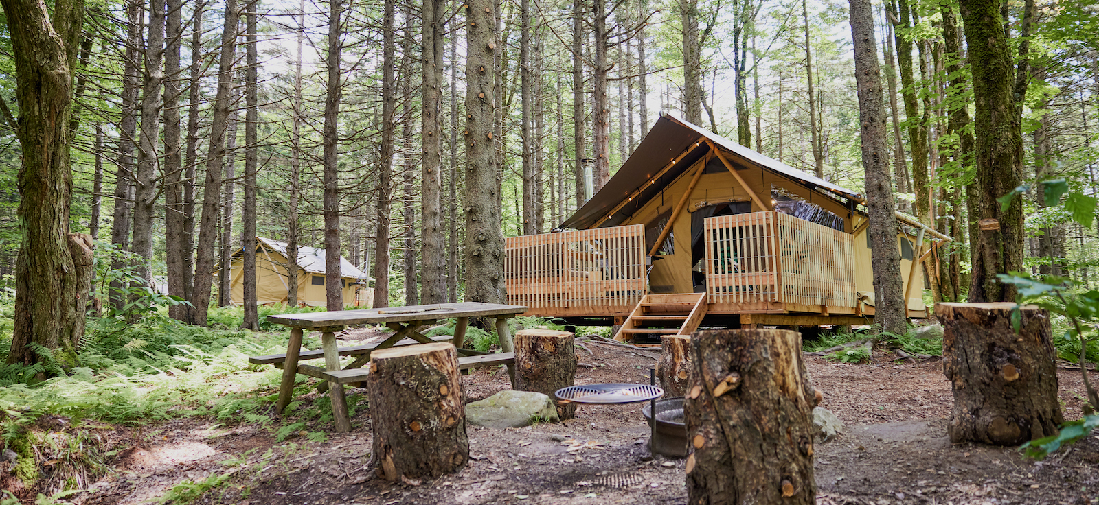 Our Trappeur + tent offers families comforts of home like electricity, a kitchen and a bathroom, along with a cozy wood burning stove in a beautiful natural environment. Enjoy your own private patio with patio furniture to truly live the outdoor life!