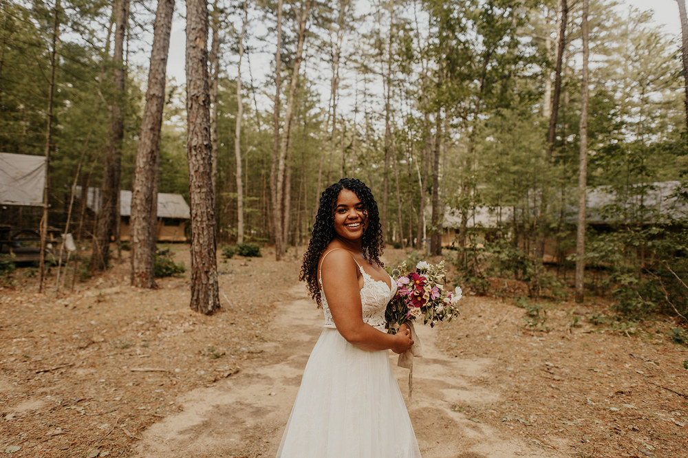 Tents and cabins with cozy beds and private bathrooms