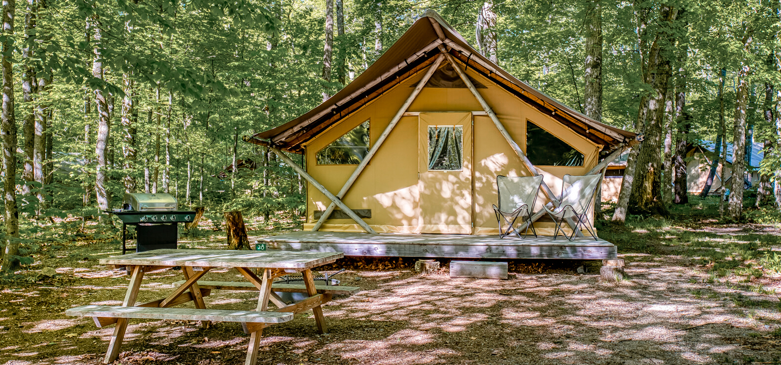 Dans cette Tente Toile & Bois design et tout confort vous vivez la nature en toute liberté ! A l’extérieur, profitez de votre trou à feu individuel ainsi que d’un barbecue et une table de pique-nique. A l’intérieur, ses deux chambres, sa cuisine équipée et son coin repas et surtout, sa salle de bain, vous garantissent des vacances en toute sérénité. Le paradis !