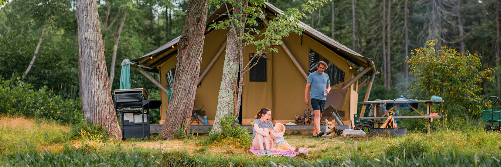 Dans cette Tente Toile & Bois design et tout confort vous vivez la nature en toute liberté ! A l’extérieur, profitez de votre trou à feu individuel ainsi que d’un barbecue et une table de pique-nique. A l’intérieur, ses deux chambres, sa cuisine équipée et son coin repas et surtout, sa salle de bain, vous garantissent des vacances en toute sérénité. Le paradis !