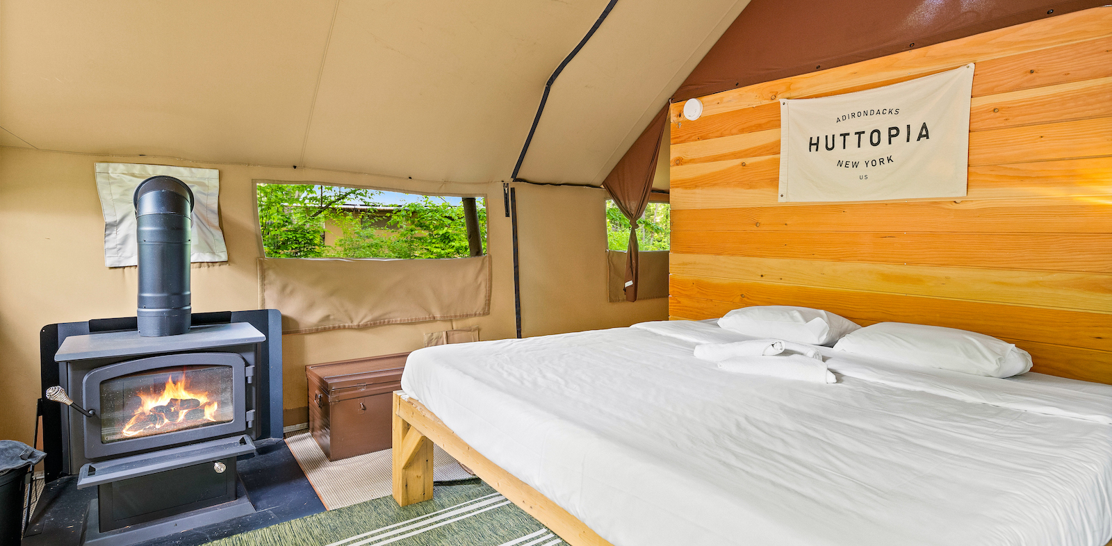Nos tentes Trappeur Duo Nature sont idéales pour les couples qui cherchent à se rapprocher de la nature et l’un de l’autre dans une tente tout confort avec un vrai lit king. Le côté « Nature » du nom signifie qu’il n’y a pas de courant, mais des lampes à piles diffusent une lueur chaleureuse à l’intérieur et une toilette privée chimique offre un petit confort supplémentaire. Les tentes Trappeur Duo Nature ont également été placées dans des zones plus privées, à l’écart des autres clients, ce qui est une bonne chose quand on veut s’éloigner de tout.