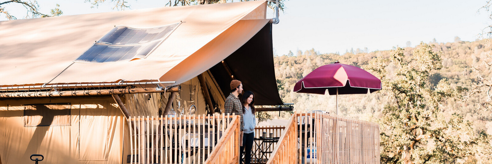 La Trappeur Duo (Zone Adultes) se situe dans un espace réservé aux adultes, pour plus de calme et de sérénité. Notre tente offre un grand espace pour deux personnes, avec un lit king, une salle de bain privée avec douche ainsi qu'une large terrasse et fonctionne exclusivement à l'électricité solaire.