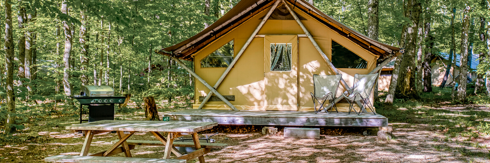 Pour un confort ultime, cette Trappeur intègre une salle de bain privative avec douche et toilettes ainsi qu’un espace cuisine et un poêle à bois! Avec deux chambres, cette tente tout équipée n’attend plus que vous, votre famille et vos amis.