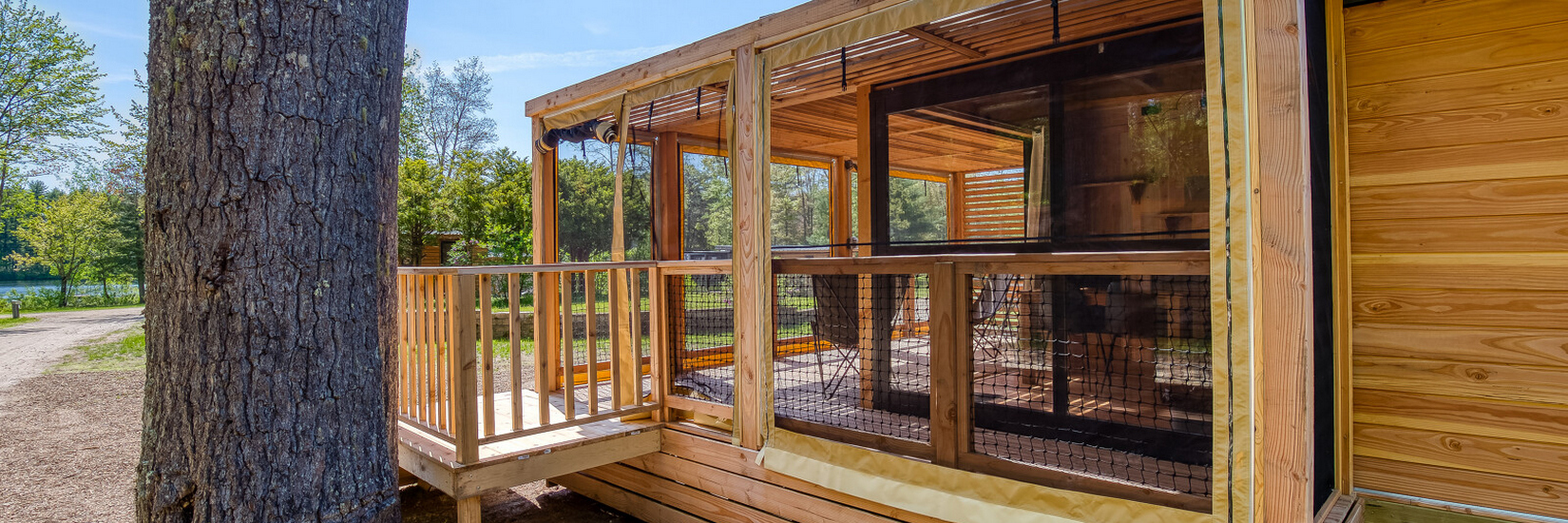 Extérieur : Grande terrasse avec moustiquaire, table et chaises, table de pique-nique, barbecue, trou à feu