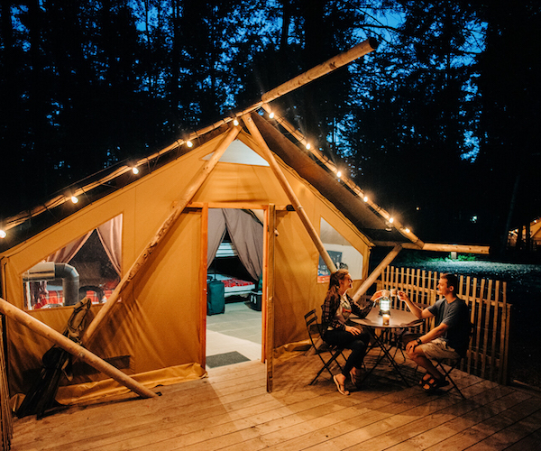 Profitez d’une escapade romantique en plein air dans notre Bonaventure – une tente confortable et douillette avec le confort d’un vrai lit, de lumières et bien davantage.