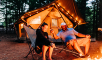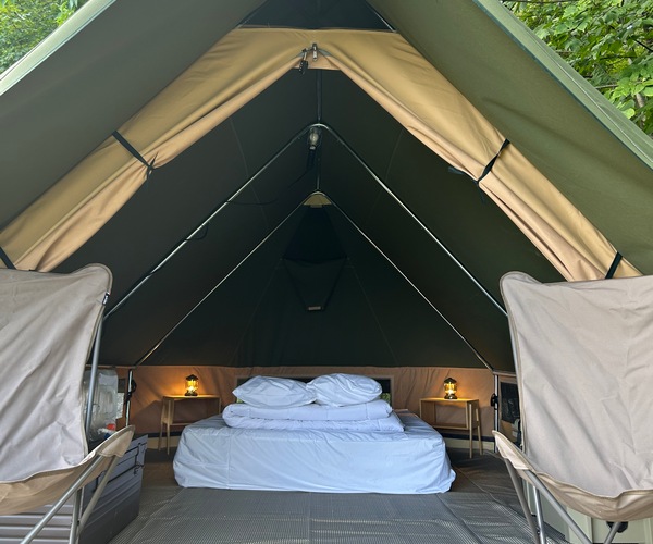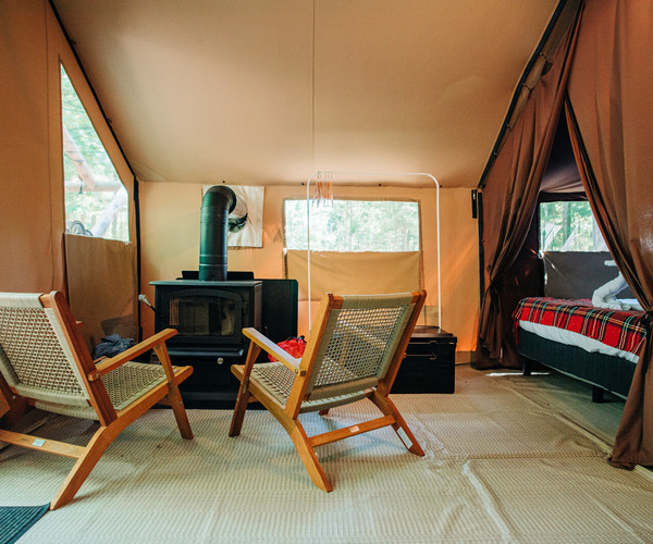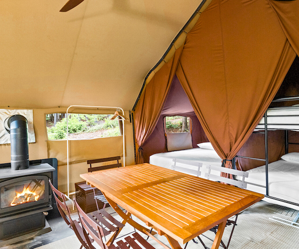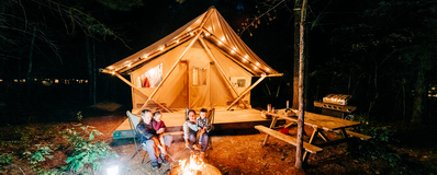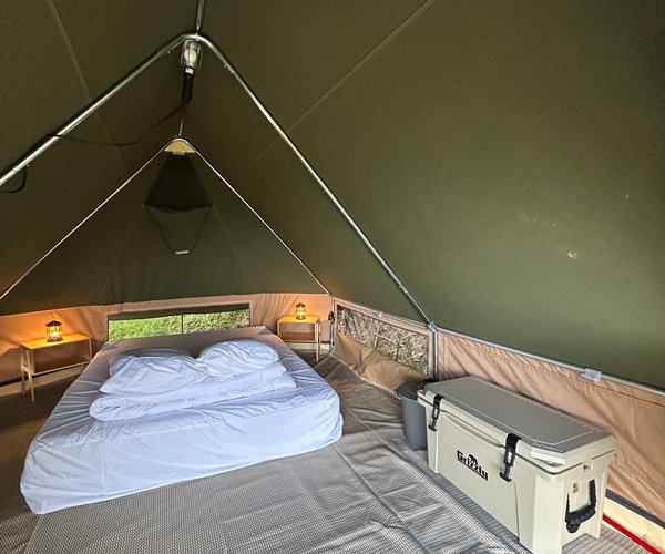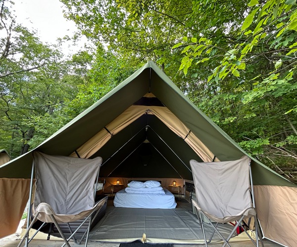 Profitez d’une escapade romantique en plein air dans notre Bonaventure – une tente confortable et douillette avec le confort d’un vrai lit, d’une glacière, d’électricité et plus encore.