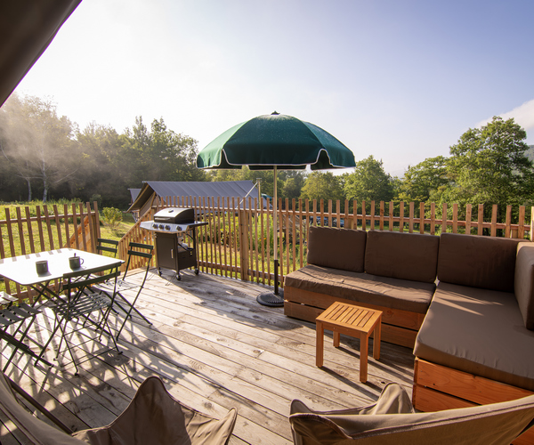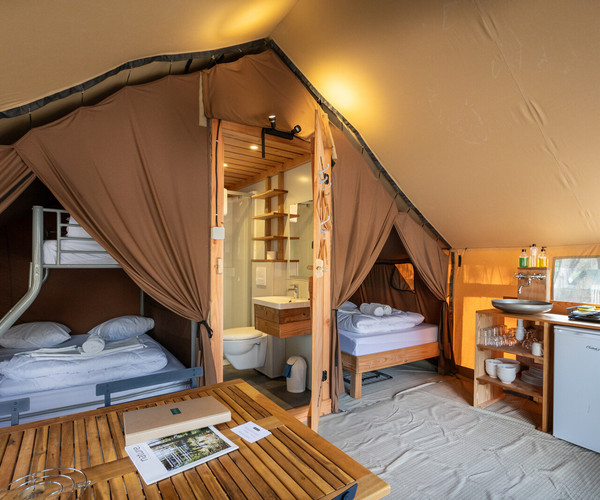 Notre grande tente Trappeur offre un espace exceptionnel pour les familles ainsi que des conforts tels qu’une petite salle d’eau privée, de vrais lits et matelas, un coin cuisine et l’électricité, dans un environnement naturel magnifique.