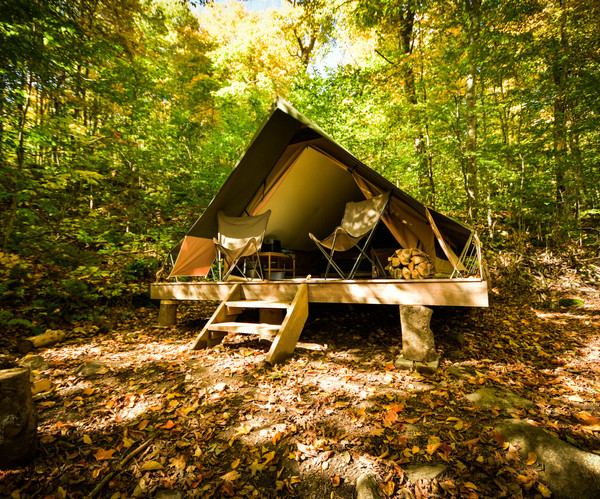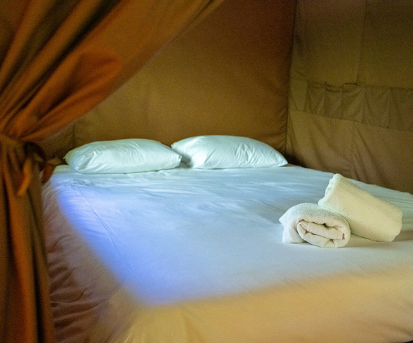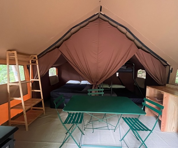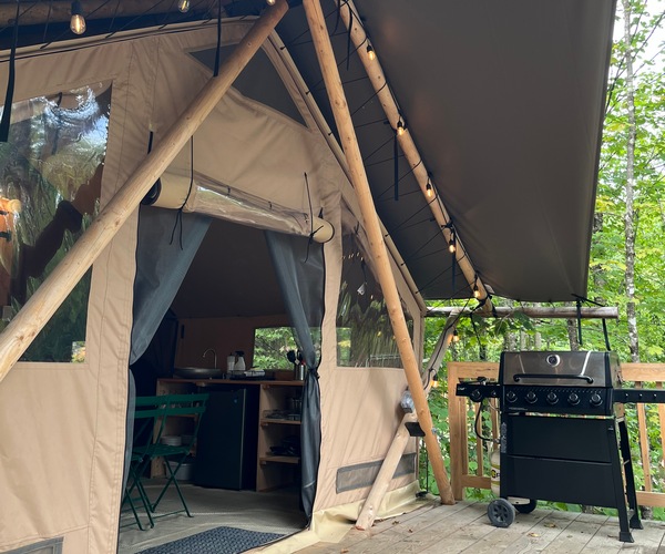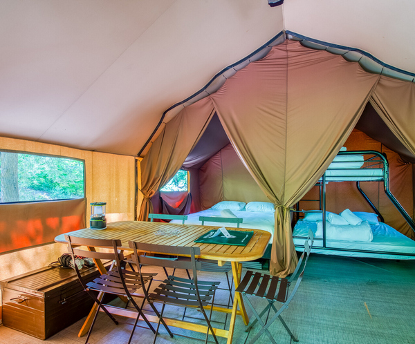 Notre grande tente Trappeur offre un espace exceptionnel pour les familles ainsi que des conforts tels qu’une petite salle d’eau privée, de vrais lits et matelas, un coin cuisine et l’électricité dans un environnement naturel magnifique.
