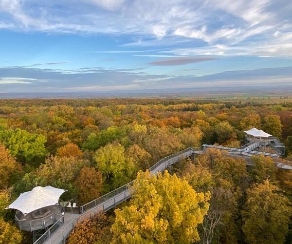 Une promenade sur une structure en hauteur menant à une tour d’observation panoramique de 40 mètres, offrant une vue imprenable sur la région.