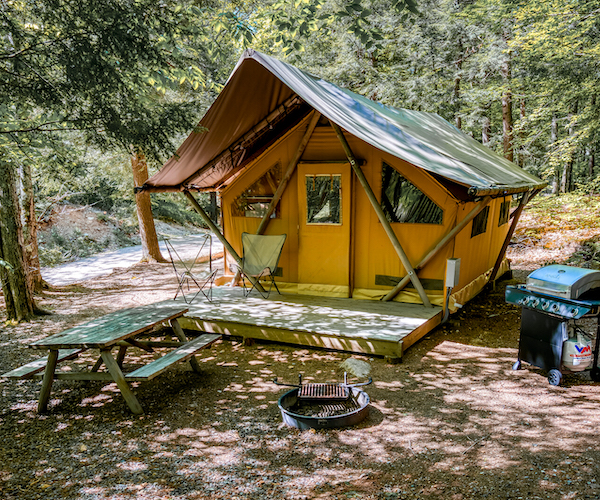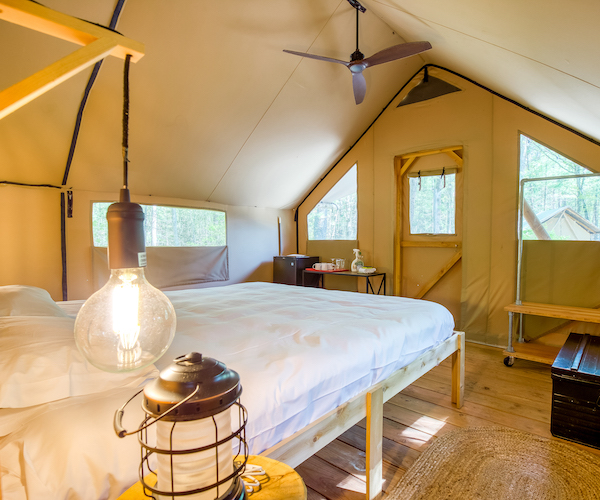 Parfaite pour une escapade romantique, cette tente tout confort vous plonge dans une ambiance intime et naturelle. Profitez d’un grand lit king-size, d’une kitchenette équipée et d’une terrasse privative au cœur de la forêt du sud du Maine.